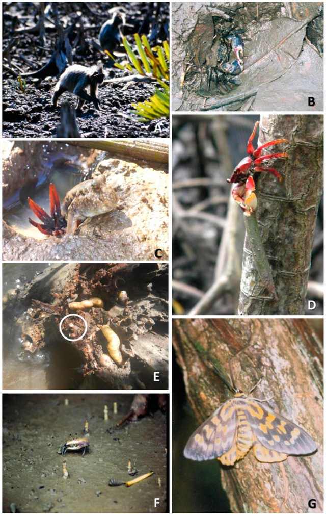 相较于螃蟹,红树林中昆虫的功能作用研究相对匮乏,已知种类丰富(如鞘翅目和鳞翅目)且特有种比例高。虽然自然状态下昆虫造成的落叶比例通常很低(约2%),对养分循环影响甚微,但在特定情况下(如爆发成灾、人为干扰富营养化或修复区),食叶昆虫会严重损害叶片和顶芽,显著影响树木生长、繁殖更新和森林结构,成为重要的生态胁迫因子。
