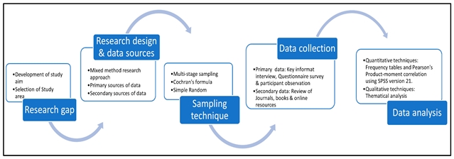 本研究采用混合方法研究设计(见文中图2),利用一手和二手数据来源,探讨尼日利亚埃努古地区当地饮食文化遗产、文化价值观与可持续发展之间的关系。二手数据来源包括期刊、文章、书籍和网络资源,用于构建研究背景并回顾现有文献。这些二手数据为本研究提供了宝贵的见解和理论基础。在收集一手数据方面,本研究采用混合方法,结合了定量和定性技术。定量部分包括向不同受访群体发放半结构式问卷。定性部分包括参与式观察和关键信息人访谈。