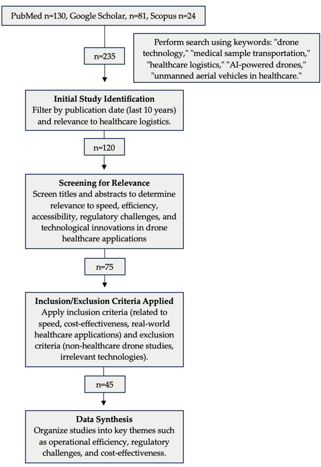 本文采用叙述性综述方法,系统检索PubMed、Google Scholar和Scopus数据库中近十年的相关文献,关键词包括“无人机技术”、“医疗样本运输”、“人工智能导航”等。最终纳入45篇文献进行主题分析,涵盖运输速度、成本效益、监管障碍、技术创新等方面。通过案例比较和主题归纳,提炼出无人机在医疗物流中的共性优势与挑战。