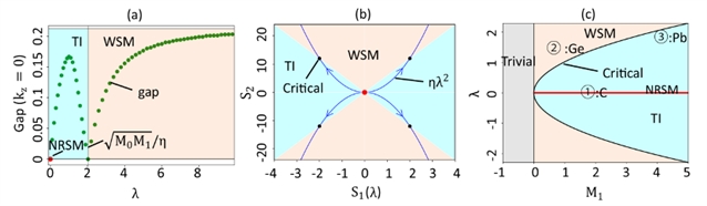 图1:最小k·p模型的相图。(a) 以平面上的能隙和自旋轨道耦合强度为变量的拓扑相图。能隙闭合是拓扑相变的标志。(b)以参数和为变量的相图,它们分别对应一阶和二阶 SOC 项。(c) 以 SOC 强度和层内跃迁强度为变量的拓扑相图。LiYC、LiNdGe 和 KLaPb 的近似参数及相区位置分别用 ①、② 和 ③ 标出。