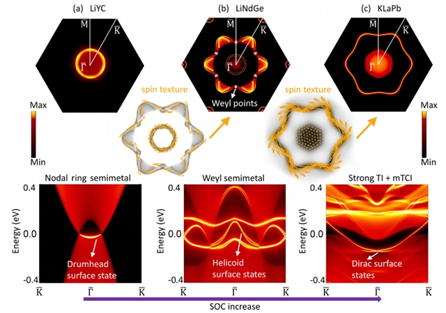 近日,中国科学院理论物理研究所张田田副研究员团队在《物理评论B》(Physical Review B)发表题为《Spin-orbit driven topological phases in kagome materials》的研究论文,并被选为编辑推荐(Editors’ Suggestion)。该工作以IAMX(IA-碱金属元素,M-稀土元素,X-碳族元素)家族材料为对象,系统研究了其拓扑性质,并提出有效模型,揭示了SOC在这种三维堆叠蜂窝-笼目材料中可以作为连续调控拓扑物态的关键自由度。该文指出,在无SOC极限下,IAMX家族可表现为节线半金属;随着SOC增强,体系可依次经历从节线半金属到强拓扑绝缘体,再到临界无隙态,最终进入外尔半金属的拓扑相变过程,从而形成丰富的全局拓扑相图。与此同时,材料的表面态也随之发生连续演化:在SOC的二阶微扰恒定或者影响较小时,体系从无SOC时的鼓膜表面态,发展为外尔半金属相中的费米弧与螺旋表面态,进一步在强SOC下并合成单个表面Dirac锥,展现出体拓扑与表面电子结构之间清晰而统一的对应关系。为验证该有效模型的正确性,研究人员进一步结合第一性原理计算与紧束缚模型,对三种具有不同SOC强度的代表性材料LiYC、LiNdGe和KLaPb进行了系统分析,包括轨道成分,拓扑数计算等。最终发现它们分别对应弱、中、强SOC区间下的不同拓扑相,分别落在统一相图中的不同区域,与模型预测严格一致,从而表明IAMX家族为研究SOC驱动拓扑相变及表面态重构提供了一类理想的材料平台。