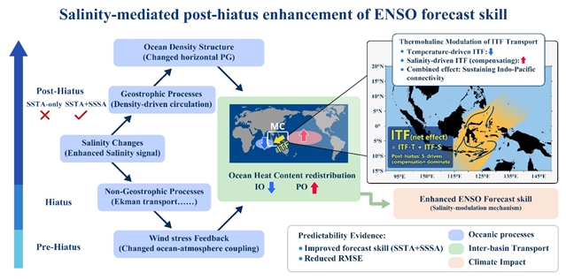 ENSO是全球最重要的气候变率模态之一,对极端天气、生态系统及社会经济具有深远影响。然而,自2000年前后全球变暖“停滞期”(1998年~2013年)以来,传统基于海表温度(SST)的ENSO预测能力显著下降,预测提前期缩短、不确定性增加,其成因长期未被清晰认识。