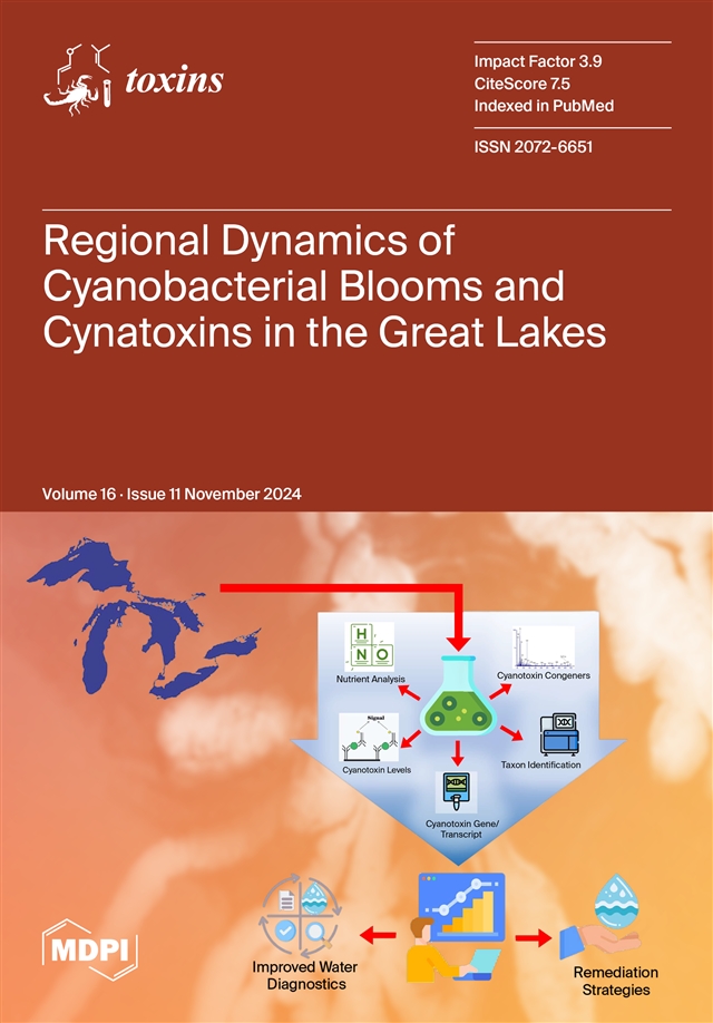 Saleem, F.; Jiang, J.L.; Li, E.; Tran, K.; Boere, A.; Rahman, M.; Paschos, A.; Westrick, J.A.; Zastepa, A.; Edge, T.A.; et al. Regional and Longitudinal Dynamics of Cyanobacterial Blooms/Cyanobiome and Cyanotoxin Production in the Great Lakes Area. Toxins 2024, 16, 471. https://doi.org/10.3390/toxins16110471