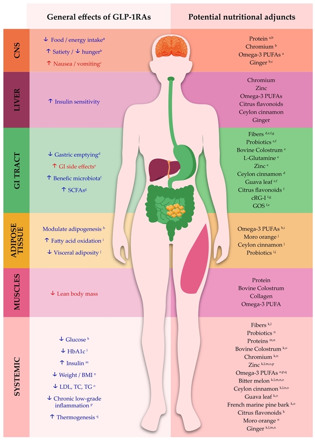 图 1:GLP-1RAs主要作用与潜在协同营养点示意图