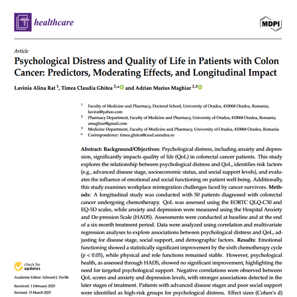 该研究发现心理困扰显著影响结直肠癌患者的生活质量,强调需在肿瘤治疗中整合心理评估和个性化干预,尤其针对晚期患者和缺乏社会支持的高风险人群。