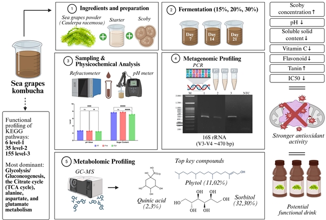 1. 海葡萄(Caulerpa racemosa)康普茶:宏基因组与代谢组学分析、作为抗氧化剂的分子作用机制及发酵时间影响的综合研究