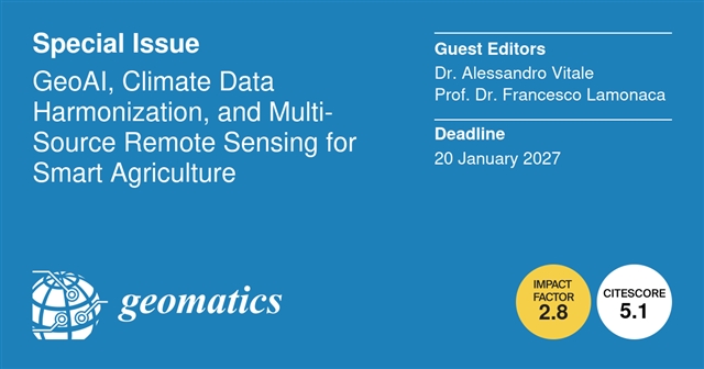 Geomatics邀请了来自意大利卡拉布里亚大学Alessandro Vitale博士和Francesco Lamonaca教授,创建特刊GeoAI, Climate Data Harmonization, and Multi-Source Remote Sensing for Smart Agriculture (面向智慧农业的 GeoAI、气候数据同化与多源遥感)。本特刊将收集高质量的方法学贡献,以探索支持气候适应型农业系统和精准农业应用的新型地理空间框架、算法和验证方法。