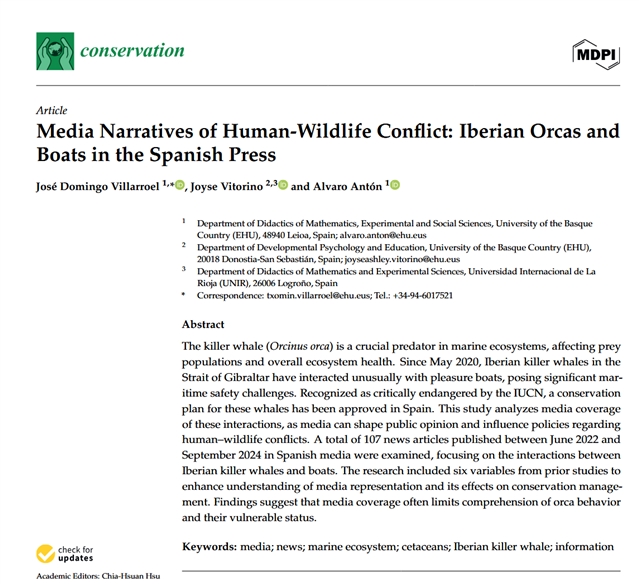 本研究分析了2022年6月至2024年9月期间西班牙媒体发表的107篇新闻报道,重点关注伊比利亚虎鲸与游艇的互动行为。研究结果表明,媒体报道往往限制了公众对虎鲸行为及其脆弱生存状况的理解。