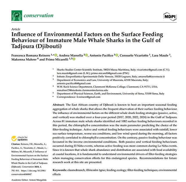 本研究在塔朱拉湾进行了为期四年 (2017、2020、2022和2024年) 的调查,旨在探究环境因素对鲸鲨不同觅食策略 (被动、主动和垂直) 的影响。
