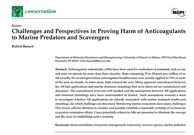 本文系统总结并深入讨论了所观察到的抗凝血灭鼠剂诱饵投放与海洋哺乳动物搁浅事件之间的诸多关联。研究结果表明,需开展进一步研究,以调查抗凝血灭鼠剂的投放是否与海洋哺乳动物的死亡及搁浅事件存在直接关联,同时本研究也讨论了这方面面临的挑战。