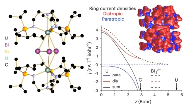 研究组报道了双铀和双钍的6π-环-Bi33−反三明治配合物的合成,这补充了为数不多的非环状和环状Bin(n=3–5)化合物。该6π-环-Bi33−环表现出显著的环电流,类似于6π-苯、2π-(C3H3)+或6π-(C3H3)3-。计算表明,6π-环-Bi33−、2π-环-Bi3+和0π-环-Bi33+具有相似的环电流,显示出σ芳香性在环-Bi33−中占据主导地位,尽管用定域键而非离域键描述环-Bi33−更为合适。6π-环-Bi33−的σ芳香性的确认为π芳香性(C3H3)+/3-提供了最重的全金属6p类似物,从而建立了有机-无机芳香性基准。