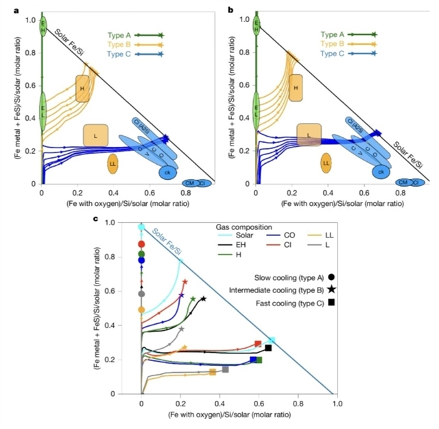 研究组检验了以下假说:球粒陨石的前体是通过动力学非平衡凝结形成的。利用一个新的时间依赖凝结模型,研究组发现改变冷却速率和压力仅能产生三种矿物学类型。偏离平衡会导致矿物学向更氧化和含水的方向演化。将预测结果投影到尤里-克雷格图上时,这些矿物学类型的氧化还原状态接近顽火辉石球粒陨石、普通球粒陨石和碳质球粒陨石。这些结果表明,球粒陨石的矿物学多样性可能在部分程度上反映了局部的凝结动力学,这为氧化条件的大范围变化假说提供了一种替代解释。