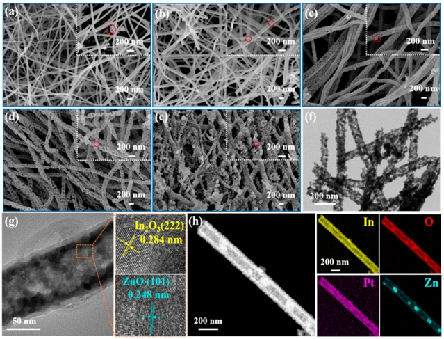 图1. (a) 未改性In2O3,(b) 0.5PtZI,(c) 1.0PtZI,(d) 2.5PtZI,(e) 5.0PtZI样品的SEM图像;(f) 25PtZI HNFs的TEM图像,(g) 对应的高分辨率TEM图像,(h) EDS元素映射图。