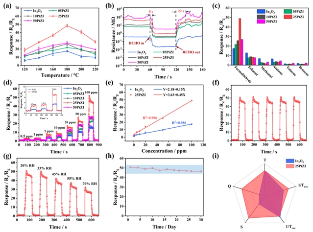 图2. 未改性In2O3、05PtZI、10PtZI、25PtZI和50PtZI HNFs传感器在180 °C下的传感特性。(a) 不同工作温度下对HCHO (100 ppm) 的响应曲线;(b) 传感器暴露于HCHO (100 ppm) 后的响应与恢复特性;(c) 传感器对100 ppm干扰气体的选择性;(d) 传感器对0.5至100 ppm浓度HCHO的响应曲线;(e) 传感器响应值与浓度线性关系曲线;(f) 25PtZI传感器对HCHO (100 ppm) 的重复性测试;(g) 25PtZI传感器在不同相对湿度 (RH) 下对HCHO (100 ppm) 的动态响应曲线;(h) 25PtZI传感器对甲醛 (100 ppm) 的长期稳定性;(i) 评估未改性In2O3和25PtZI气体传感器最佳工作状态的蜘蛛网图。