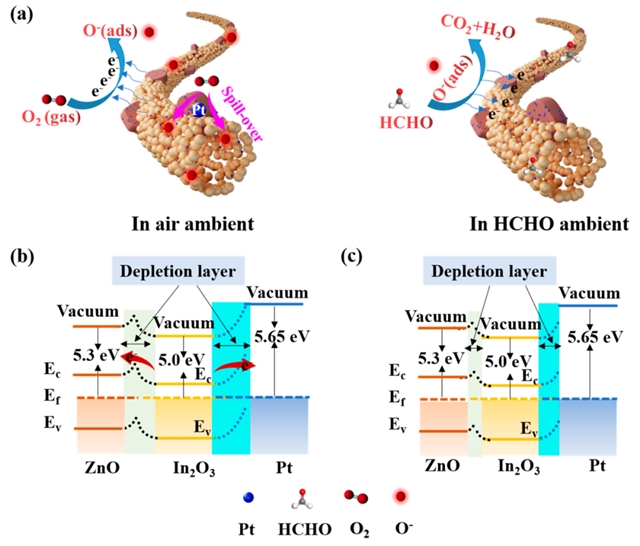 (2) Pt纳米颗粒的催化与敏化作用:均匀分散的超小Pt纳米颗粒通过“溢流效应”,可高效催化氧气分子解离,大幅提升了材料表面的吸附氧浓度。同时,部分Pt以PtO2形式存在,与n型氧化物形成p-n异质结,进一步提高了势垒高度和传感器电阻。这些因素共同导致传感器在接触甲醛气体时,电阻变化 (Ra/Rg) 更为显著,从而获得高响应值 (图3)。