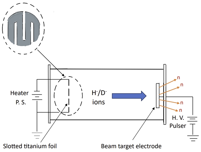 轴向型中子管(如下图)由直径约2.5厘米、长约8厘米的玻璃管构成,一端为钛箔H?/D?离子发射极,另一端为靶电极。通过加热钛箔并引入氘气与铯蒸气,可产生高纯度D?离子束,经高压加速后与靶材发生核反应产生中子。同轴型结构则采用圆柱形发射极与靶电极,可进一步提高离子流密度,并通过多层同轴设计实现更高中子产额。