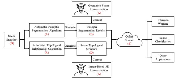 图1 面向耕地私挖乱采场景的全景分割与拓扑关系标注总体策略(K:知识;D:数据;A:算法;S:服务)。