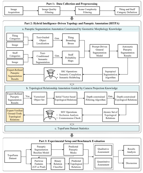 耕地保护是保障粮食安全与生态稳定的重要基础。然而,随着城镇化进程加快,耕地私挖乱采行为日益频发,给实时监测带来严峻挑战。现有计算机视觉研究多聚焦于识别场景中的物体,却较少关注物体之间空间拓扑关系的结构化建模,而这种关系正是判断挖掘设备是否侵入耕地的重要空间证据。为弥补这一研究空缺,莫干山地信实验室陈军院士课题组近日在国际期刊ISPRS International Journal of Geo-Information(ISPRS IJGI)发表最新研究成果。研究团队提出面向耕地私挖乱采场景的人机协同混合智能拓扑全景标注方法(Human-in-the-Loop Hybrid Intelligent Topological Panoptic Annotation,HITPA),并据此构建了首个拓扑标注全景数据集TopoFarm。该研究通过融合自动算法与专家知识,实现复杂工程场景中高质量、高效率的拓扑关系标注,为拓扑感知研究提供了新的技术路径。