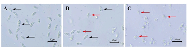 注:(A)对照组 (B)全虫蛋白疫苗组 (C)膜蛋白疫苗组;黑色箭头:虫体完整,红色箭头:虫体破裂。