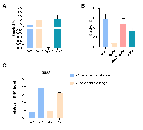 galU菌株的存活情况。B:乳酸胁迫后galU缺失、回补或过表达后菌株的存活情况。C: 有无乳酸胁迫下进化菌株A1与野生菌株galU的转录水平。