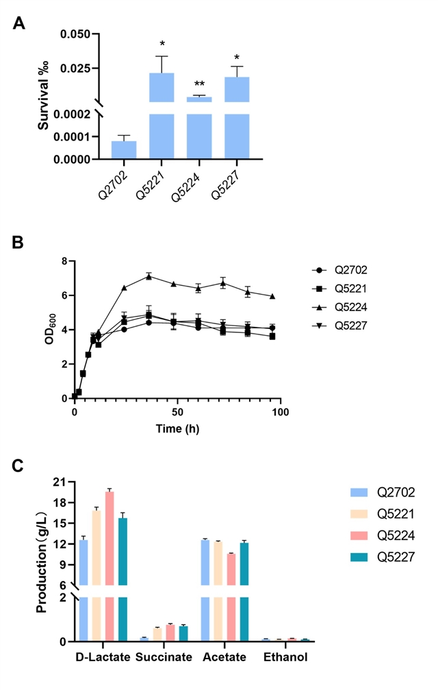 图2. 工程菌株的乳酸耐受性、细胞生长和D -乳酸生产。A:菌株经乳酸刺激后的存活能力测定。B: 菌株在摇瓶发酵中的生长曲线。C: 菌株在摇瓶发酵中产生的D -乳酸及其副产物。