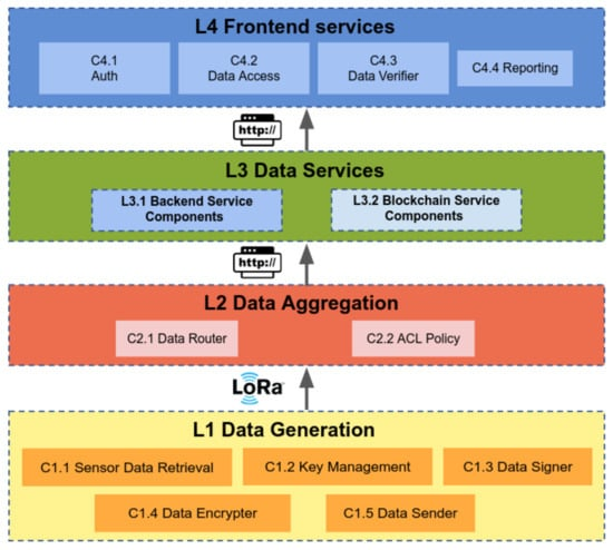 图2. 分层架构概览:图中展示了从物联网(IoT)设备层到LoRaTRUST前端服务的各组件分布。