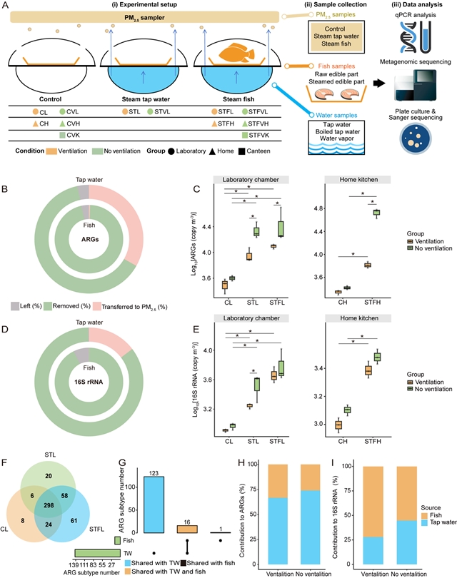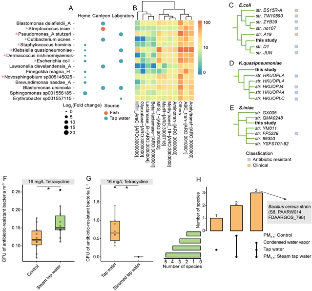 (G) 蒸鱼过程中PM2.5显著增加的ARGs亚型及其在鱼肉与自来水中的分布关联。
