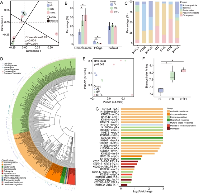 (F) 各组PM2.5中ARGs亚型的共享情况(CL:对照组;STL:蒸自来水组;STFL:蒸鱼组)。