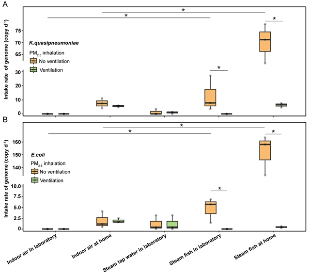 图4. 有效通风显著降低烹饪人员经呼吸暴露于ARG宿主的风险。