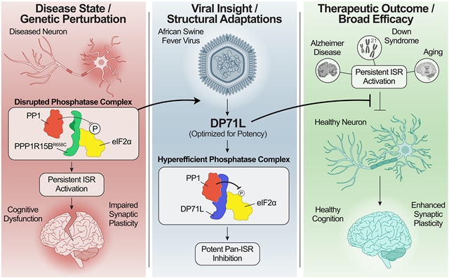 Abstract: The integrated stress response (ISR) is essential for cellular homeostasis and cognitive function. We investigated how persistent ISR activation affects cognitive performance by studying the PPP1R15BR658C genetic variant associated with intellectual disability. To model this condition, we generated a mouse line with the pathogenic allele inserted. This variant destabilized the PPP1R15BPP1 phosphatase complex, causing persistent ISR activation, impaired protein synthesis, and long-term memory deficits. We demonstrated that the cognitive and synaptic impairments in Ppp1r15bR658C mice arise directly from ISR activation. Furthermore, we characterized DP71L, a viral ortholog of PPP1R15B, which acted as a potent pan-ISR inhibitor. DP71L reversed the cognitive and synaptic deficits across mouse models of Down syndrome, Alzheimer’s disease, and aging, and enhanced synaptic plasticity and memory in healthy mice.