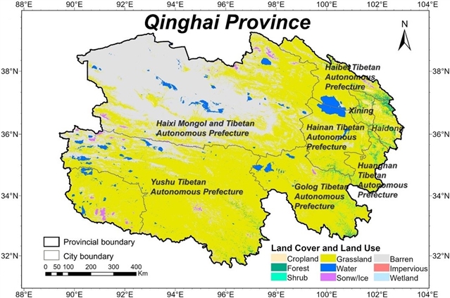 青海省位于青藏高原的东北部,以草原为主要土地覆盖类型,是国家生态文明建设的重点区域,也是全球最具影响力的生态调节区域之一。由于其独特的地理位置和气候条件,青海省的生态环境相对简单、脆弱,对人类扰动和气候变化高度敏感。因此中国政府在青海省实施了多项生态保护政策。该研究以中国青海省为研究区域 (见图1),基于2000—2023年长时间序列数据,系统分析该省生态环境的演变特征。