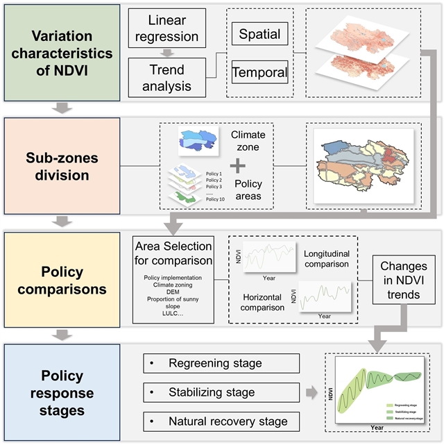 自20世纪70年代以来,中国政府实施了一系列生态政策,旨在减轻生态系统损害和退化,推动生态环境保护与修复。然而,由于这些政策具有实施周期长、资金投入巨大的特点,其执行效果存在区域差异,导致政策实际成效难以精准评估。并且,在全球气候变化的背景下,这些政策对生态改善的精确效果仍不明确。因此需要从区域尺度对多种生态政策与生态建设项目进行全面评估,并分析政策实施阶段的变化,以优化区域生态政策的战略方向。