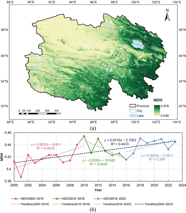 2000年至2023年,青海省NDVI平均值为0.4238,其空间分布呈现东部和南部较高,西部和北部较低的空间格局 (图3),在人类活动强度较低的区域NDVI值较高。研究期内,青海省NDVI呈现显著上升趋势,该趋势可划分为三个阶段:2000年至2009年快速增长阶段;2010年至2016年波动下降阶段;2017年至2023年的稳定增长阶段。