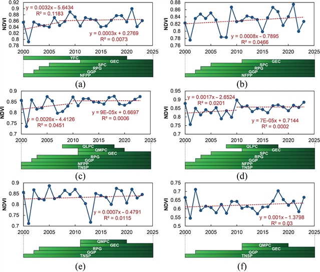 根据NDVI趋势以及各种生态政策的实施时间和持续时间,植被恢复可分为三个阶段:复绿阶段 (2000-2007年)、稳定阶段 (2008-2015年) 和自然恢复阶段 (2016年至今)。在复绿阶段,政策开展了大规模的人工造林和种草活动。在稳定阶段,生态保护政策巩固和提升了先前的成果,优化了治理策略和方法。在自然恢复阶段,生态政策过渡到规范化建设和治理。生态政策实施的成效与政策实施阶段密切相关。
