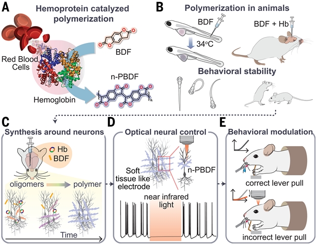 Abstract: Biocompatible integration of synthetic materials with living tissue remains a major challenge for bioelectronics. In this case, substrate-free conducting polymer (CP) interfaces could help bridge this gap. We report in vivo assembly of n-doped poly(benzodifurandione) (n-PBDF) using whole blood–catalyzed polymerization in awake zebrafish and mice. This approach leverages endogenous catalysts, specifically hemoproteins, to form stable, thermally and ionically sensitive CP networks, ensuring long-term compatibility throughout the lifespan. We showcase the impact of this interface through reversible, cellular, and subcellular neuromodulation using near-infrared (NIR) light, including in vivo polymerized n-PBDF. Electrophysiological studies confirmed that n-PBDF alters intrinsic sodium ion channel excitability, and NIR light stimulation amplifies this modulation through thermoionic-induced shunting, providing on-demand, millisecond-scale reversible inhibitory control of excitability, a feature recapitulated in actively behaving mice.