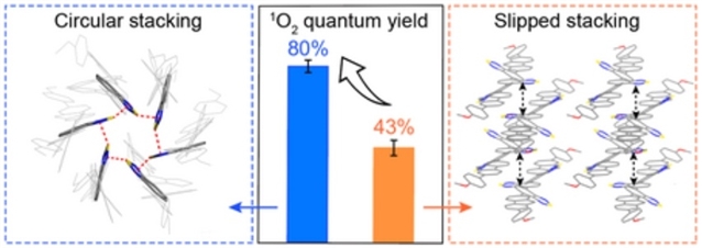 Abstract: Herein, we report a triple-acceptor donor–acceptor (D–A) molecule designed with three consecutively linked acceptors to confer substantial conformational flexibility. This conformational flexibility translates into distinct crystalline packing modes, which yield strikingly different photosensitizing efficiencies. Notably, a unique crystal structure is formed by the self-assembly of six distinct conformers into a circular architecture via intermolecular chalcogen bonding, an arrangement unambiguously confirmed by single-crystal X-ray diffraction. The cyclic assembly delivers an impressive solid-state 1O2 quantum yield of 80%, a value far higher than that of the solution-dispersed monomer (62%) and a non-cyclically packed polymorph with both chalcogen bonds and π-interactions between A groups (43%). This enhancement stems from the unique circular packing motif that increases the energy mismatch between the singlet excited state (S1) and singlet ground state (S0) to facilitate intersystem crossing (ISC), while concurrently suppressing π–π stacking–induced quenching. The generality of this strategy is further demonstrated by a heavy-atom-containing analogue, which achieves a similarly high 1O2 quantum yield of 84% in its chalcogen-bond-directed circular assembly (comprising three conformers), markedly outperforming a counterpart polymorph (45%) with both chalcogen bonds and π-interactions between A groups and non-circular packing. These findings establish a versatile and robust approach for developing high-performance crystalline photosensitizers.