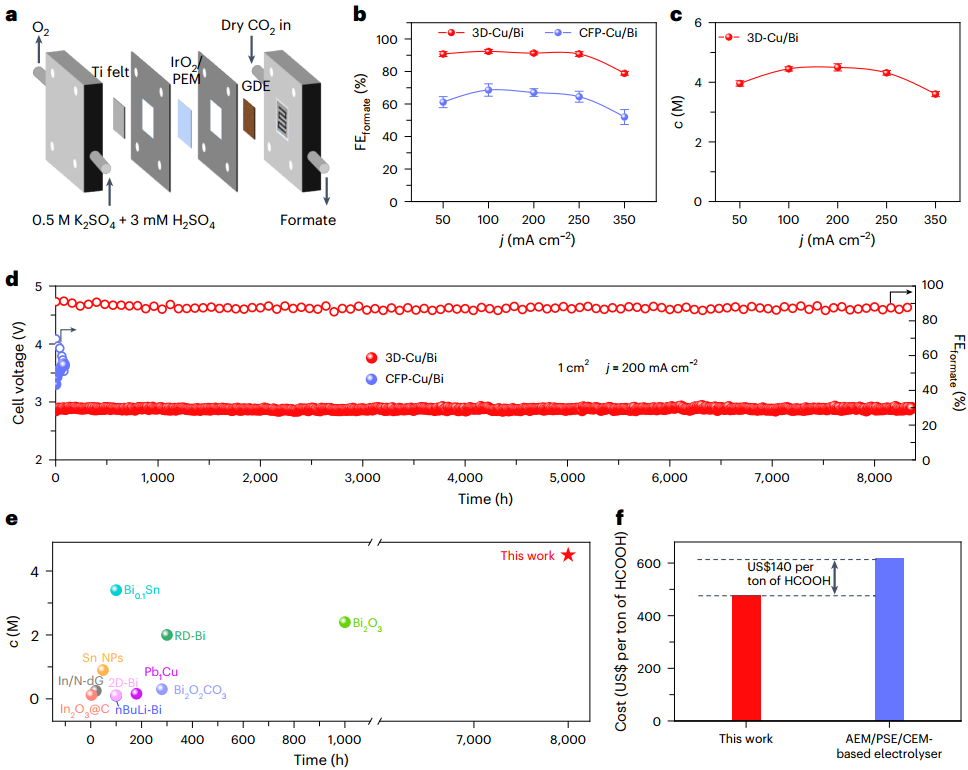 电催化CO2还原连续制备高浓度甲酸盐超8000小时