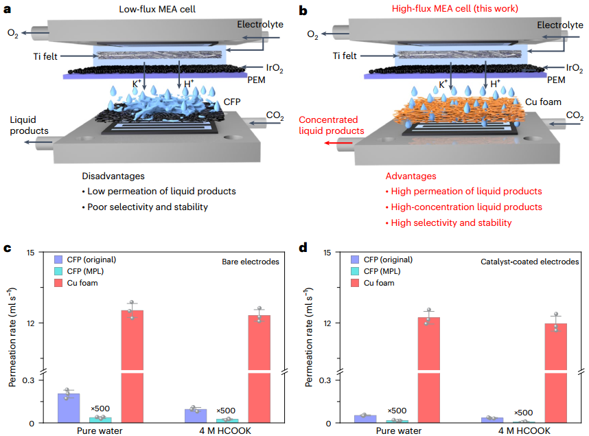 近日,天津理工大学鲁统部教授、余自友教授团队提出采用高通量泡沫铜作为催化剂载体,利用其丰富且贯通的三维大孔道结构,为液体产物提供高效传质通道,强化产物从催化剂表面的快速脱附与定向转移,从而实现甲酸盐液体产物的高浓度、长时间连续制备。2026年4月3日,该研究以“A high-flux membrane electrode assembly for CO2 electroreduction to 4.5 M formate with over 8,000 h stability”为题,在线发表于Nature Catalysis期刊。同时相关技术团队正与中国石油兰州石化公司开展中试实验。