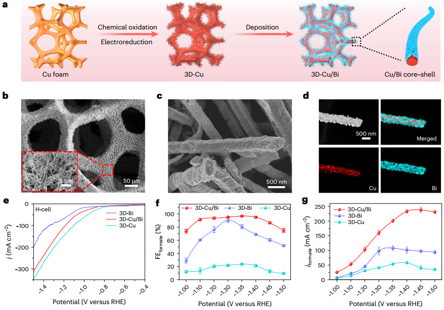 图2:3D-Cu/Bi催化剂的制备、表征及CO2RR性能研究。