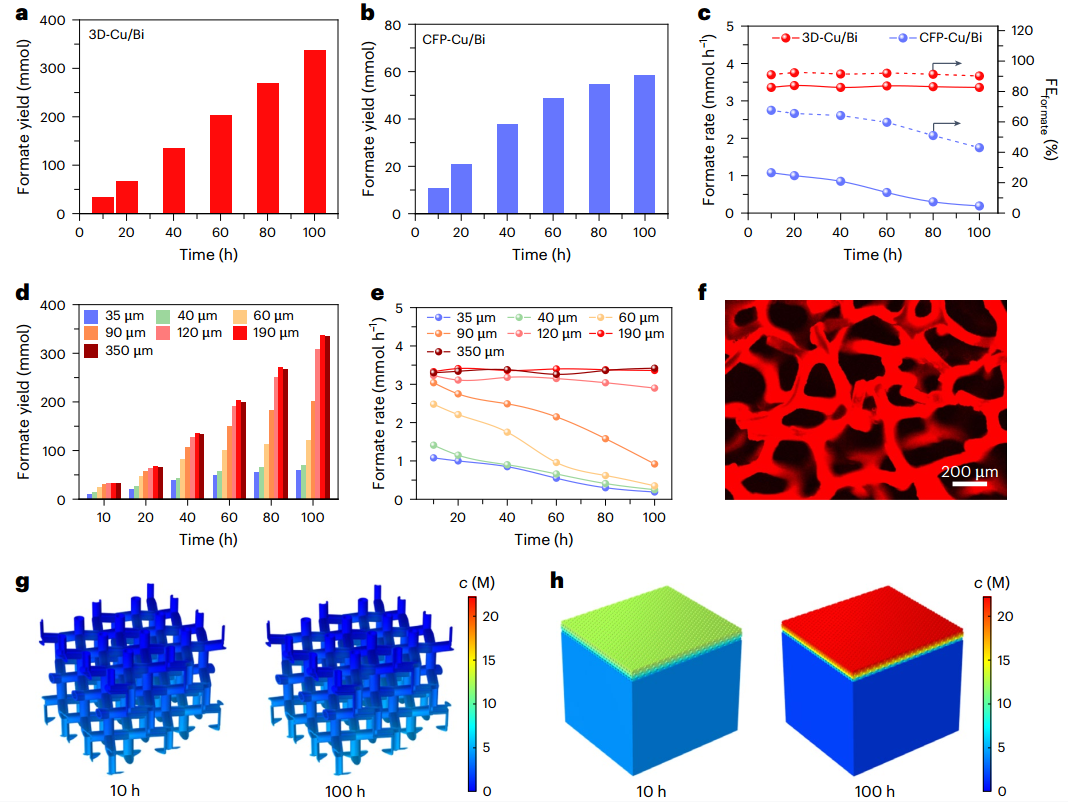 基于此,研究组提出采用高通量泡沫铜作为催化剂载体,利用其丰富且贯通的三维大孔道结构,为液体产物提供高效传质通道,强化产物从催化剂表面的快速脱附与定向转移,从而实现甲酸盐液体产物的高浓度、长时间连续制备。通过在三维泡沫铜基底上原位构筑Cu/Bi核壳结构纳米线,将其作为CO2还原催化剂应用于膜电极电解槽。在仅通入干燥CO2、不加阴极电解液、电流密度为200 mA/cm2的条件下,电解槽能够在长达8000小时连续产生4.5 mol/L的甲酸盐,且法拉第效率始终维持在90%左右,该综合性能(产物浓度-稳定性-选择性)达到当前文献报道的最高水平。而传统的碳纸基电解槽性能快速衰减,仅在100小时内就出现失活现象。为进一步验证应用潜力,研究组将小尺寸电解槽拓展至100 cm2大尺寸电解槽,在20 A恒定电流运行时,催化剂仍保持优异的催化活性与结构稳定性,未出现任何性能衰减,为后续工业化放大奠定了基础。