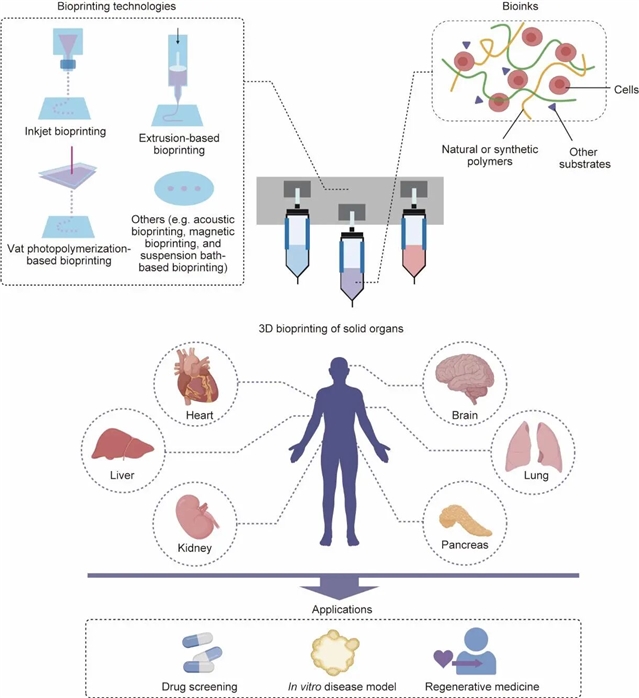 3D生物打印技术借助3D打印的精准定位能力,将活体和非活体生物材料进行图案化组装,进而构建出复杂的生物结构。器官生物打印通常包含两个关键步骤:首先基于通过多种成像方法获取的组织或器官信息,生成详细的3D模型;随后制造出能够忠实再现目标组织或器官结构与功能的组件。这项技术在创建兼具真实解剖特征和功能特性的实心器官方面潜力巨大,为再生医学、组织工程、药物研发、药代动力学以及基础生物细胞学等多个领域的研究提供了有力支持。