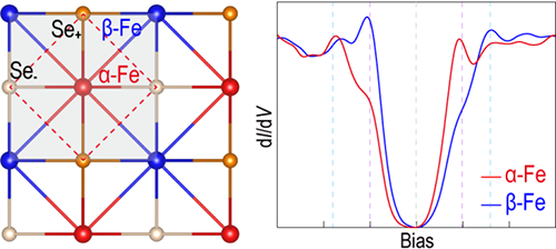 图1:单层铁基超导FeSe中的两套Fe子晶格和其上面测到的扫描隧道谱