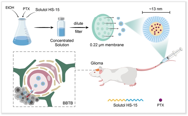 本研究开发了基于Solutol HS-15的紫杉醇纳米胶束 (PSM),其超小粒径使其能够高效穿透血脑肿瘤屏障并富集于胶质瘤部位。体内外实验表明,PSM的包封率高达96%,对C6胶质瘤细胞的IC50显著低于游离药物;在原位胶质瘤小鼠模型中,PSM表现出优于紫杉醇的抗肿瘤效果,且未出现明显的体重下降或肝肾功能损伤。此外,该制剂制备简便,使用时只需注入溶媒即可形成稳定的纳米胶束,具有良好的生物相容性及工业化生产潜力,为胶质瘤治疗提供了一种安全、高效且易于临床转化的新型纳米药物,具有良好的临床应用前景。