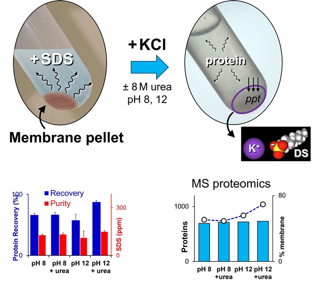 近期在Proteomes发表的这篇文章,研究团队来自加拿大达尔豪西大学,他们系统评估了用KCl沉淀去除SDS的最佳条件。研究发现,在强碱性条件(pH 12)下加入尿素,再向含SDS的膜蛋白溶液中加入KCl,SDS会与K+形成不溶性沉淀,通过离心即可去除。而膜蛋白由于保持在碱性尿素环境中,仍然保持溶解状态。