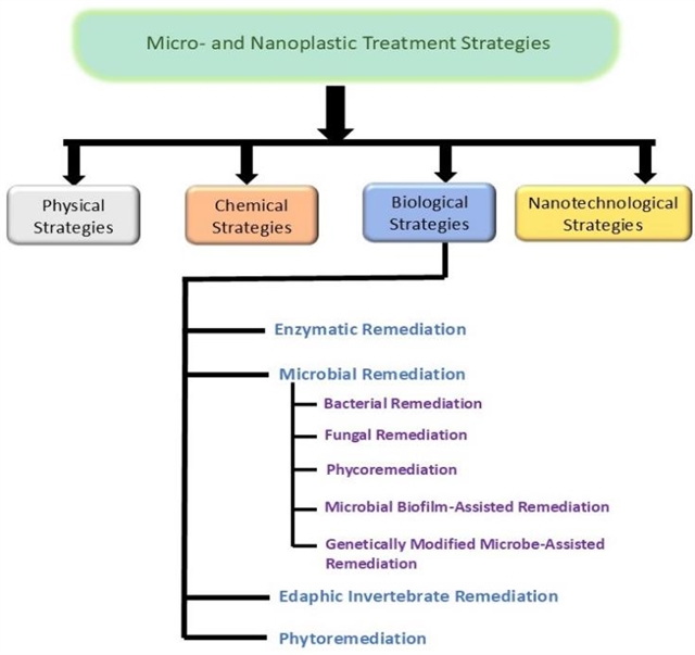 在修复策略方面,文章将路径归纳为物理、化学、生物与纳米技术等方向。物理策略包括吸附、过滤与浮选;例如砂滤对微塑料排除效率可达97%,膜生物反应器对微塑料去除效率最高可达99.4%,并有研究报告其对某些纳塑料可去除至97%,但膜污染与长期运行稳定性是突出限制。化学策略以热降解与高级氧化过程为代表,高级氧化过程依赖羟基自由基等高反应性物种,但能耗、催化剂与运行成本使其大规模应用受限。生物策略涵盖细菌、真菌、酶法、微藻、微生物生物膜(“plastisphere”)、基因改造微生物、土壤无脊椎动物辅助以及植物修复等;其中也总结了若干研究案例与降解表现。纳米技术方向强调纳米材料可增强吸附、过滤与光降解,但纳米材料自身的长期环境影响仍需评估。
