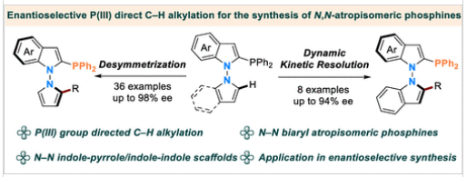 研究组报道了一种铱催化的对映选择性C-H烷基化反应,以膦(III)基团作为导向基团,用于构建N-N阻旋异构的单膦配体。该方法能够便捷地获得多种N-N连接的吲哚-吡咯及吲哚-吲哚骨架结构,对映选择性高达98% ee。此外,通过一系列合成转化和催化应用,验证了该方法的实用性。