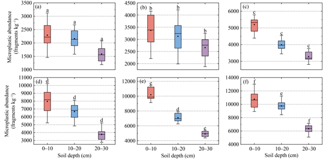 图2 不同覆膜年限下土壤三层深度微塑料丰度 (fragments·kg-1) 的垂向分布:在不同覆膜持续时间条件下,微塑料丰度在土壤剖面中的时序变化特征。(a–f) 分别对应覆膜5、10、15、20、25和30年。