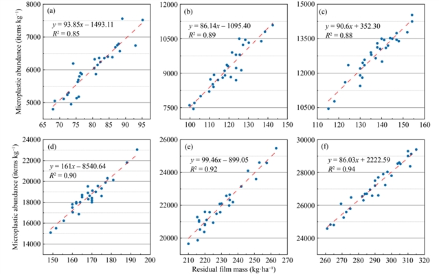 图3 不同覆膜持续时间条件下残膜质量与微塑料丰度的相关关系。(a–f) 分别对应覆膜5、10、15、20、25和30年。