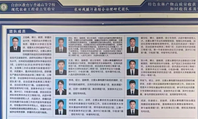 团队负责人王旭峰教授长期从事现代农业装备与农田残膜污染治理技术研究,在残膜回收机械结构设计、关键部件优化及田间作业模式构建等方面积累了丰富经验,主持和参与多项国家及省部级科研项目,推动了南疆特色农作物残膜污染治理装备的研发与应用,为区域农业机械化与生态治理协同发展作出了重要贡献。