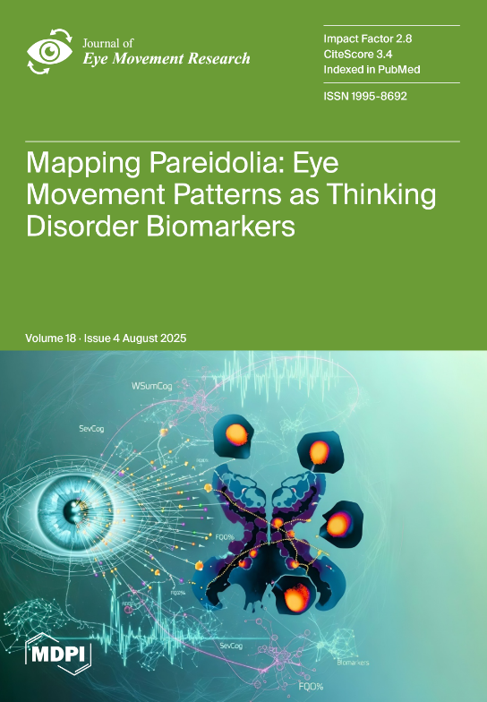 Boyle, M.; Dauphin, B.; Greene, H.H.; Juve, M.; Day-Suba, E. Eye Movements During Pareidolia: Exploring Biomarkers for Thinking and Perception Problems on the Rorschach. J. Eye Mov. Res. 2025, 18, 32.